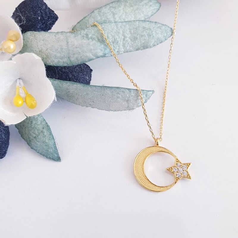 925 Ayar Gümüş Gold Ay Yıldız Kadın Kolye
