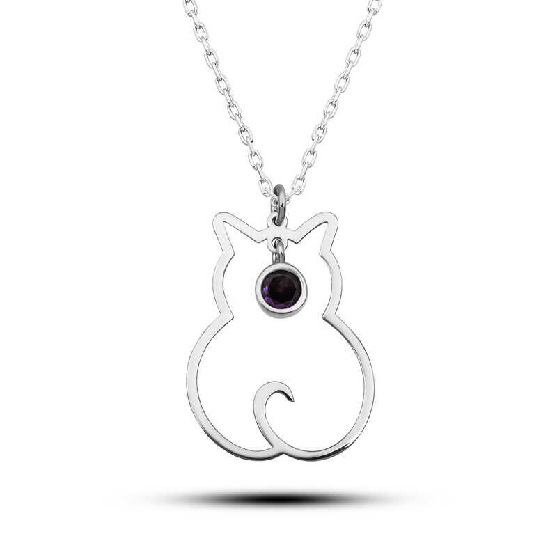 925 Ayar Gümüş Şubat Ayı Doğum Taşı Kedi Kadın Kolye