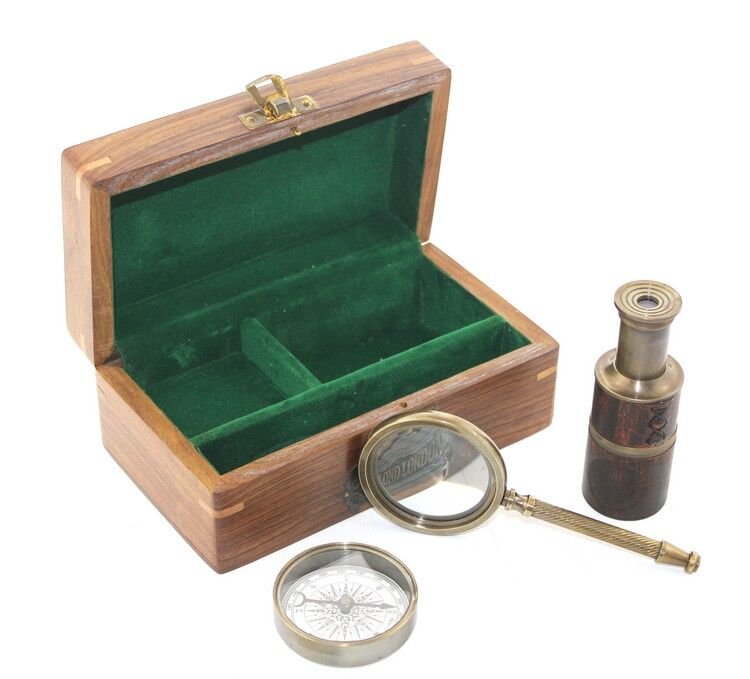 Ahşap Kutu Pirinç Pusula Dürbün Büyüteç Seti