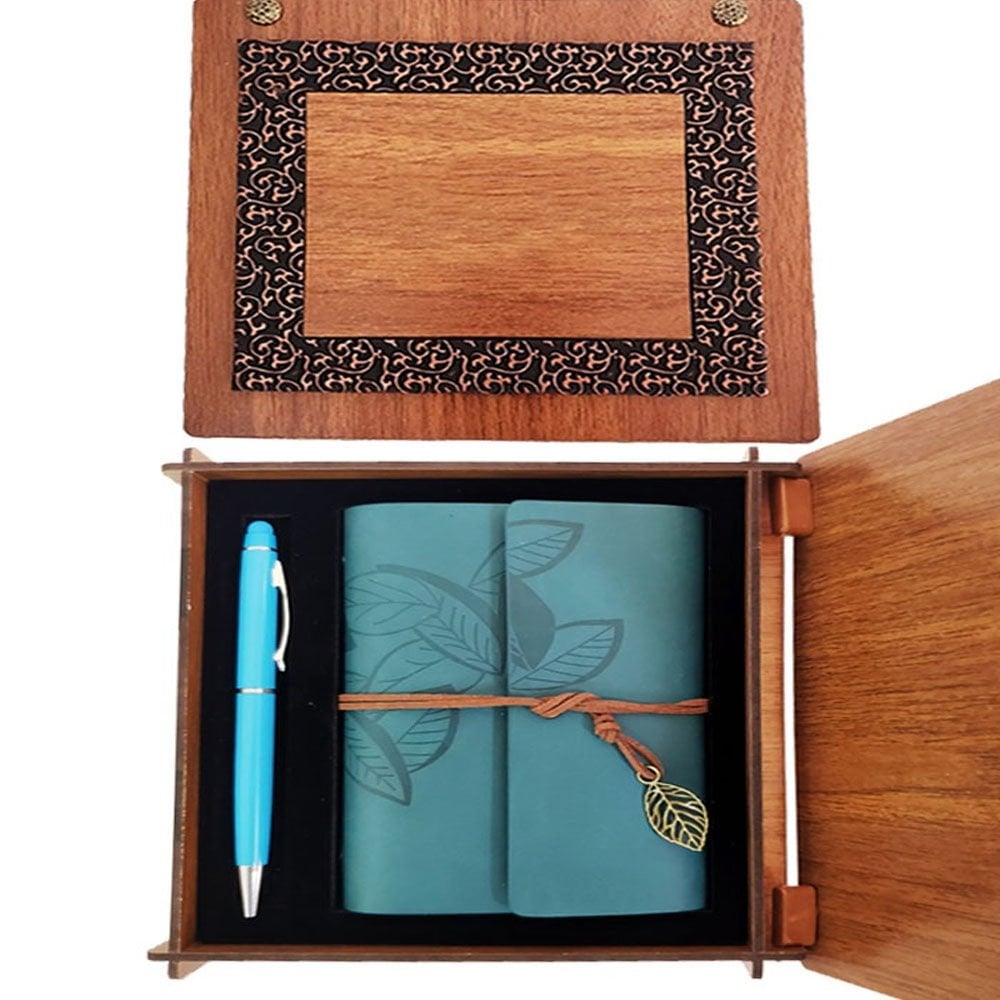 Ahşap Kutulu Mavi Deri Defter Kalem Seti