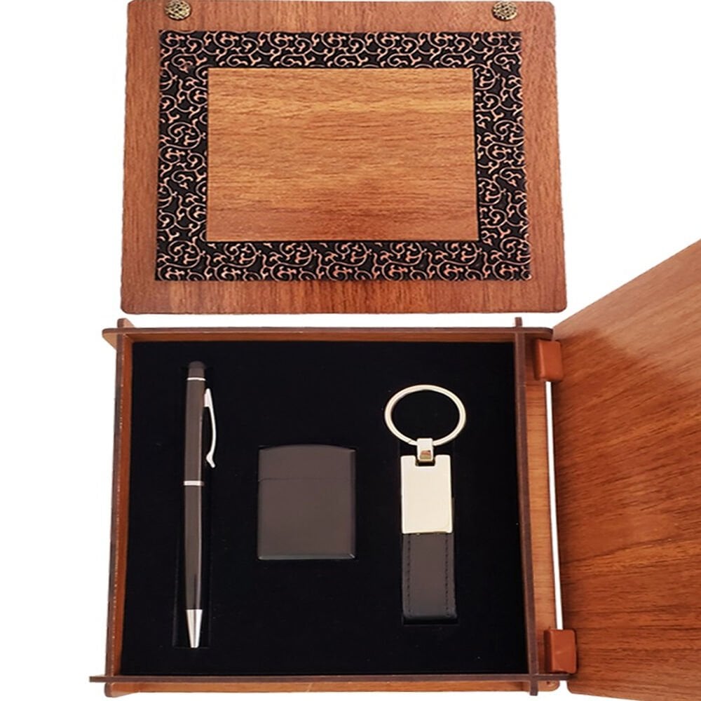 Ahşap Kutulu Siyah Kalem Anahtarlık ve Mat Çakmak