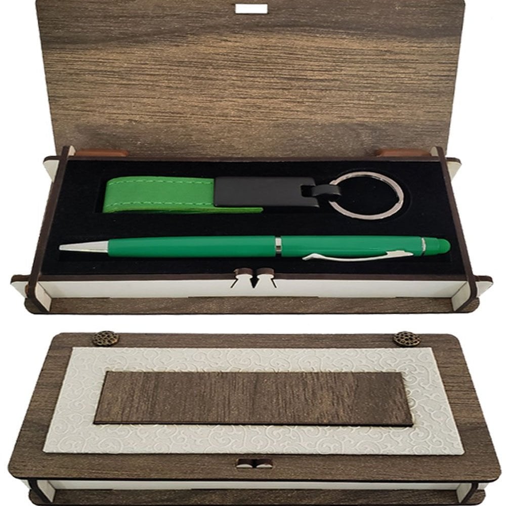 Ahşap Kutulu Yeşil Anahtarlık ve Kalem Set