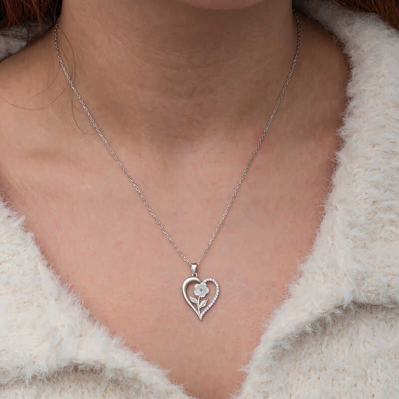 Gümüş Kalpli Beyaz Gül Kadın Kolye