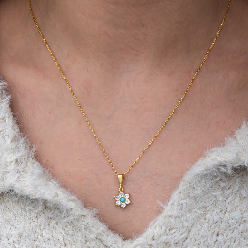Gümüş Mavi Taşlı Gold Çiçek Kadın Kolye
