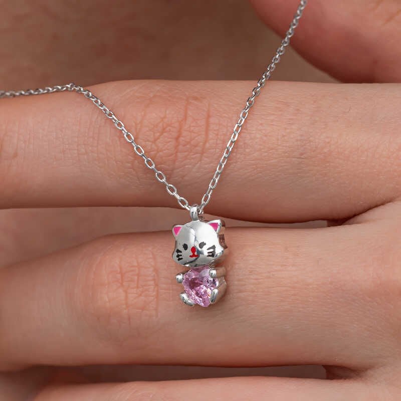 Gümüş Pembe Taşlı Sevimli Kedi Kadın Kolye