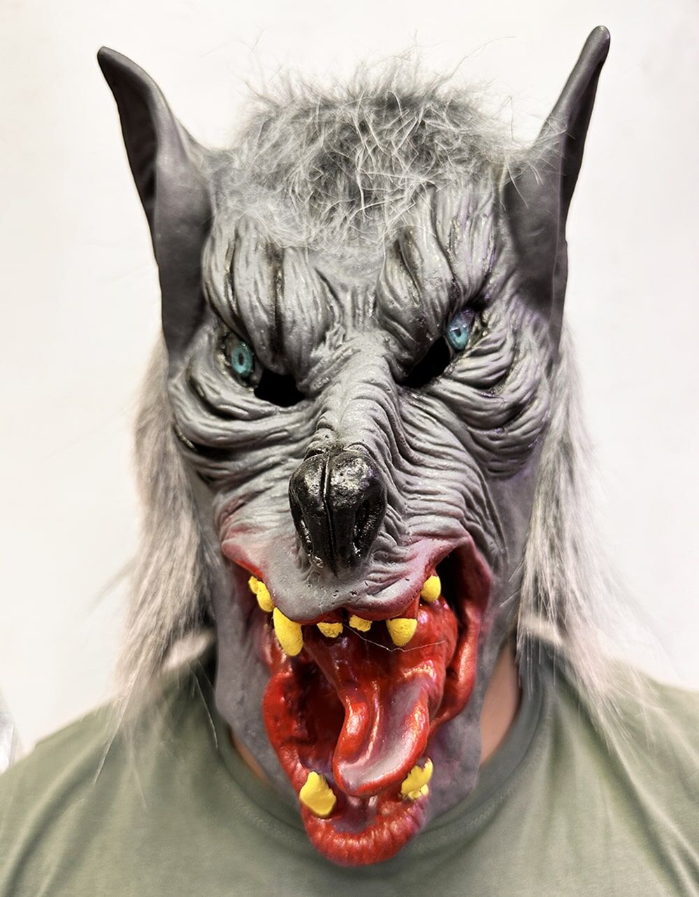 Kafaya Tam Geçmeli Lateks Dil Çıkaran Mavi Gözlü Kurt Maskesi