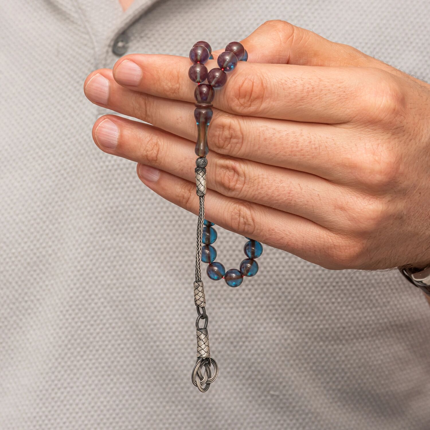Gümüş Kazaz Püsküllü Şeffaf Mavi Sıkma Kehribar Tesbih