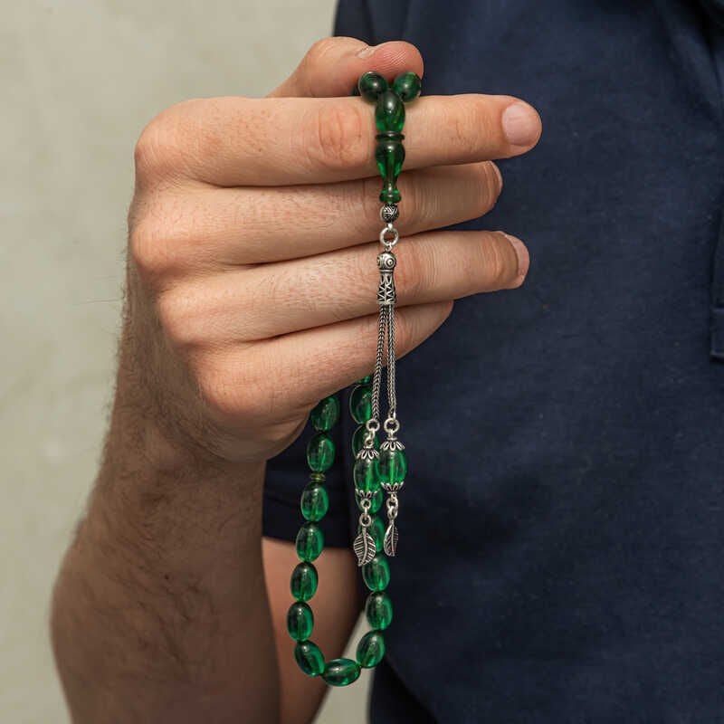 Gümüş Püsküllü Yeşil Ateş Kehribar Tesbih