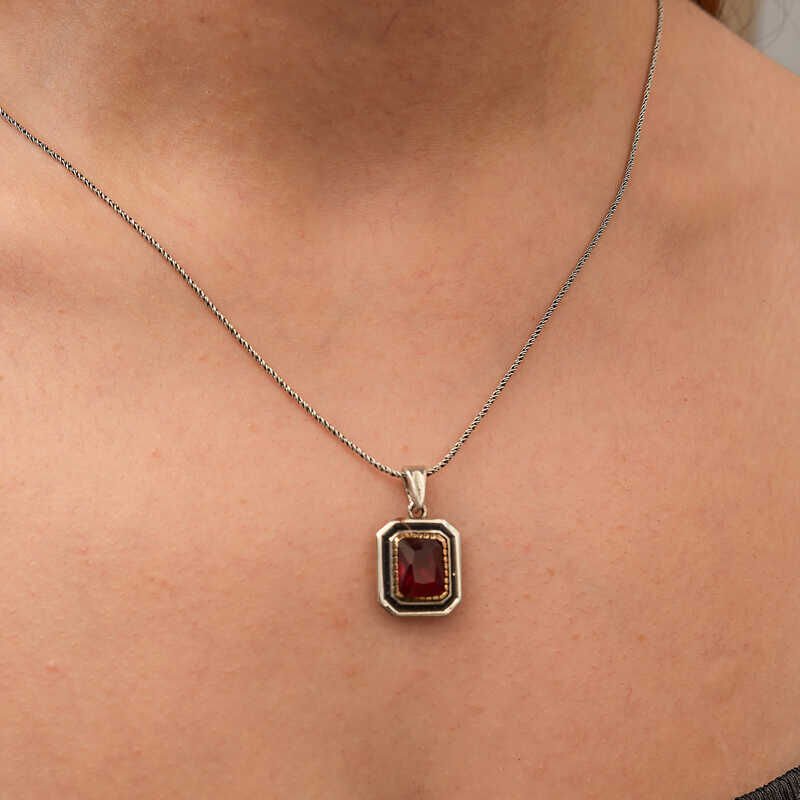 Gümüş Kırmızı Taşlı Dikdörtgen Kadın Kolye