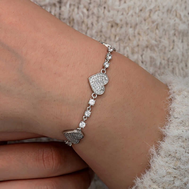 Gümüş Zirkon Taşlı Sıralı Kalp Kadın Bileklik